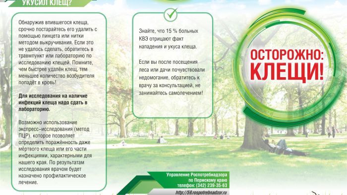 19 Ноября 2024 Осторожно : КЛЕЩИ ! Самой эффективной мерой профилактики заболевания является вакцинация.В нашей Поликлинике работает Кабинет иммунопрофилактики (каб. № 7),где ВЫ МОЖЕТЕ СДЕЛАТЬ ПРИВИВКИ против клещевого энцефалита. Режим работы Кабинета иммунопрофилактики (каб. №7):пн.: 08-00 ч. - 16-00 ч.вт.: 08-00 ч. - 16-00 ч.ср.: 08-00 ч. - 16-00 ч.чт.: 08-00 ч. - 16-00 ч.пт.: 08-00 ч. - 16-00 ч.Перерыв с 13-00 ч. – 14-00 ч.сб.: Выходнойвс.: ВыходнойВакцинация проводится БЕСПЛАТНО по полису ОМС!Помните, болезнь легче предупредить, чем лечить!Вовремя поставленная прививкасможет оградить вас и ваших родственниковот тяжелых последствий опасных инфекционных заболеваний.Записаться можно через:Единая региональная информационно – справочная служба с   бесплатным федеральным номером «122»через портал Госуслугчерез сайт «k-vrachu.ru»телефон регистратуры: 2-42-62Задать вопросы экспертам, а также узнать больше о прививках вы сможете на сайте федерального проекта ЯПРИВИТ. КВЭ - острое инфекционное вирусное заболевание, с преимущественным поражением центральной нервной системы. Последствия заболевания: от полного выздоровления до нарушений здоровья, приводящих к инвалидности и смерти. Возбудитель болезни (арбовирус) передается человеку в первые минуты присасывания зараженного вирусом клеща. К заражению КВЭ восприимчивы все люди, независимо от возраста и пола. Все территории Пермского края являются эндемичными по заболеваемости КВЭ.ОБСЛЕДОВАНИЕ КЛЕЩЕЙ                                                                                                                           Перечень сезонных лабораторий по исследованию клеща на вирус клещевого энцефалита, боррелии, ГАЧ, МЭЧ и адреса пунктов приема клещей на исследование на 2025г№ п/пПеречень лабораторийАдрес пункта приема клещей на исследование1ГБУЗ ПК «Верещагинская центральная районная больница» г. Верещагино, ул.Октябрьская,74,      т.   8 34 254 3 36 68.(Исследования — КВЭ)ГБУЗ ПК «Верещагинская центральная районная больница» г.Верещагино, ул.Октябрьская,74. Тел. 8 34 254 3 36 68. Режим работы: пн. - пят. С 08:00 - до 14:00, обед с 12:00-12:30, сб., вс., праздничные дни-  выходные дни. Дата открытия -28.04.2025 г.2ГБУЗ ПК «Карагайская ЦРБ», Карагайский район, с. Карагай, ул. Калинина , 26.(Исследования — КВЭ)ГБУЗ ПК «Карагайская ЦРБ», Карагайский район, с. Карагай, ул. Калинина , 26.  Режим работы: пн. - пят. С 08:00 до 16:00, обед с 13:00-14:00, сб., вс., праздничные дни-  выходные дни.3ГБУЗ ПК «Нытвенская ЦРБ» г. Нытва, ул. Чкалова, 61. Телефон:     8 34 272 4 30 13.  (Исследования — КВЭ)ГБУЗ ПК «Нытвенская ЦРБ» Клинико-диагностическая лаборатория Режим работы: с 8:00 до 15:30 в будние дни. В выходные и праздничные дни приема нет.  Тел. 8 34 272 4 30 13Приемное отделение  г. Нытва, ул. Чкалова, 61. КРУГЛОСУТОЧНО Телефон: 8 34 272 4 30 40 .4ФБУЗ «Центр гигиены и эпидемиологии в Пермском крае», г. Пермь, ул.Сысольская,4. (Исследования - КВЭ, ИКБ, МЭЧ, ГАЧ)ФБУЗ «Центр гигиены и эпидемиологии в Пермском крае» Западный филиал, г. Пермь, ул. Сысольская, 4, контактный телефон: 8(342) 284-11-92; 89223048152.Режим приема клещей: с 08.30 до 16.00 (рабочие, выходные и праздничные дни) (суббота, воскресенье).5ГБУЗ ПК «Пермская краевая клиническая инфекционная больница», лаборатория клинической иммунологии г. Пермь, ул. Космонавта Леонова, 84 а. Телефон:     8 342 233 -92-16 доб.51 (Исследования - КВЭ, ИКБ, МЭЧ, ГАЧ)ГБУЗ ПК «Пермская краевая клиническая 